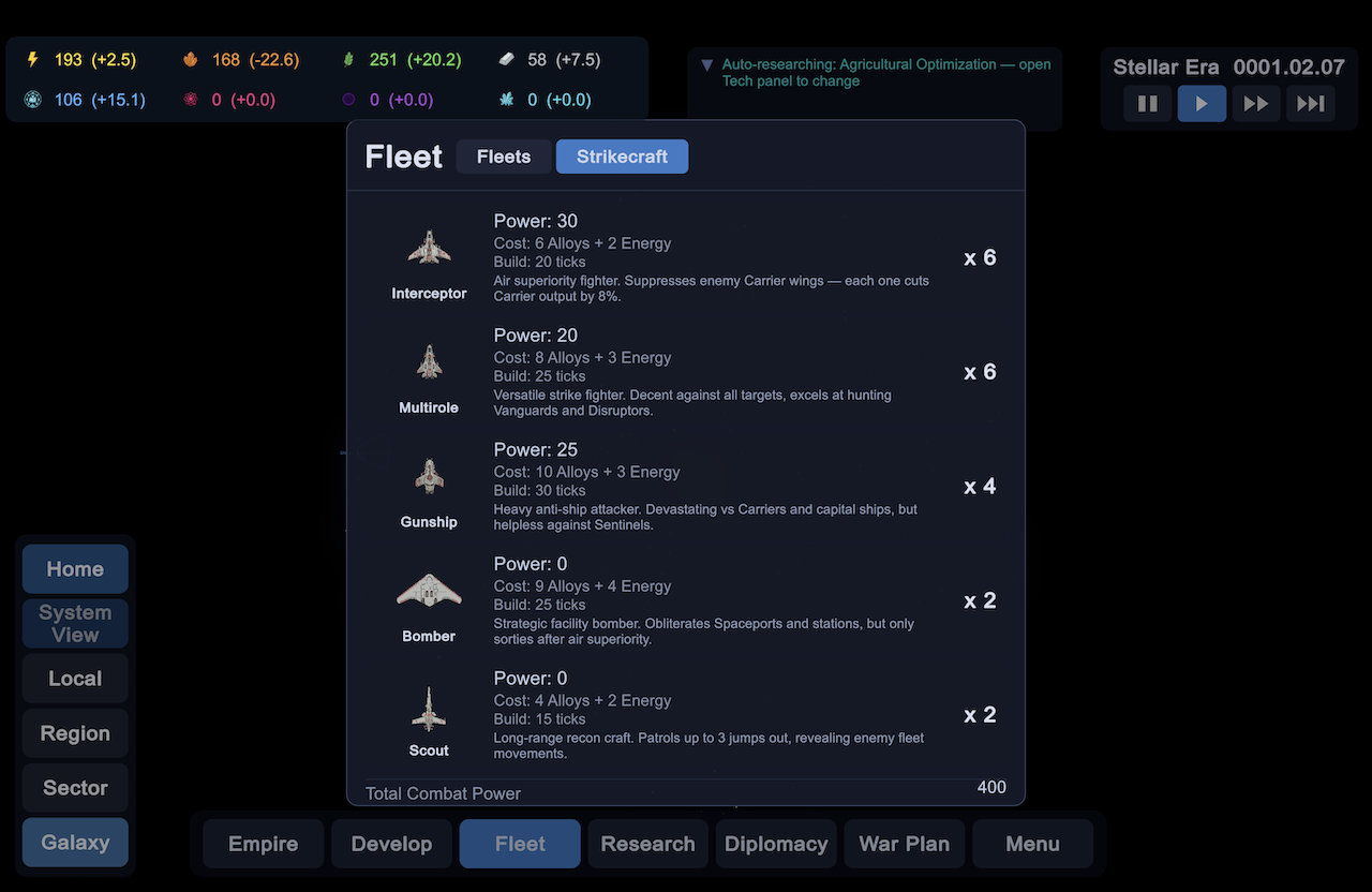 Two-phase warfare. Wars begin with strikecraft border skirmishes — autonomous fighter wings clash over contested systems in a brutal war of attrition. Only after air superiority is established do your capital fleets push in for the kill. Rushing fleets into contested airspace is suicide.
