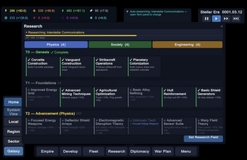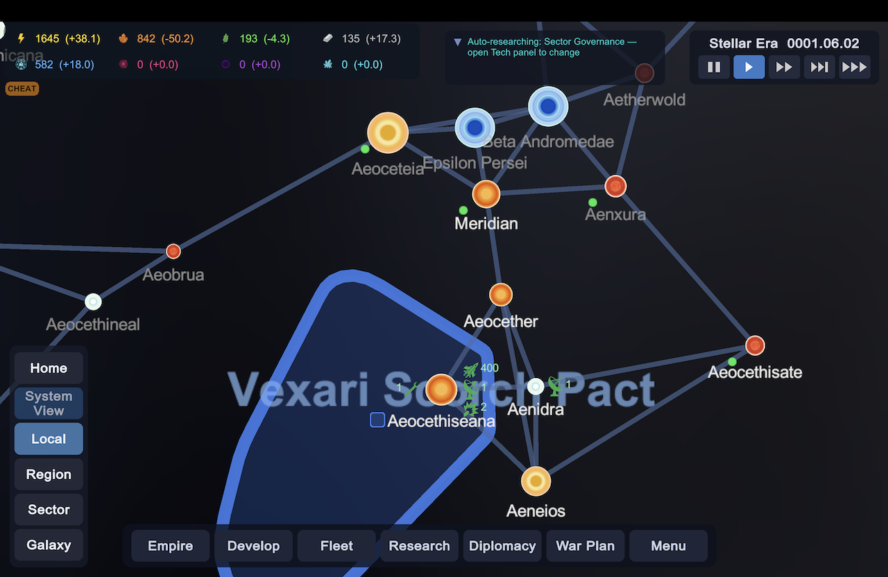 An economy that fights back. Minerals feed alloy refineries. Alloys build ships. Ships cost energy to maintain. Expand too fast and your economy collapses. Expand too slow and your neighbors eat you alive.